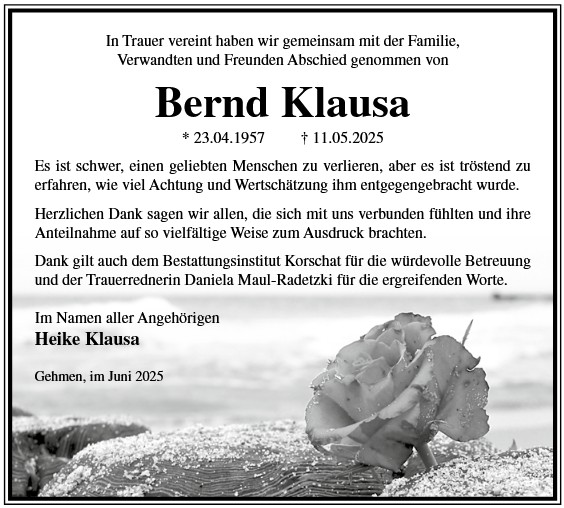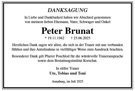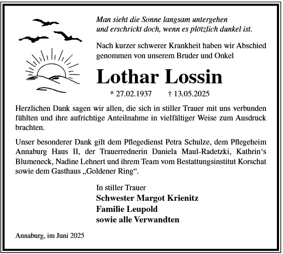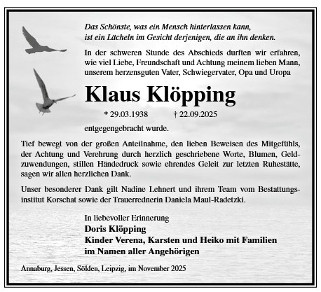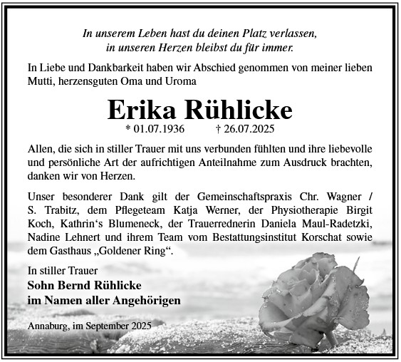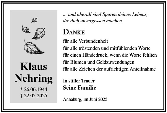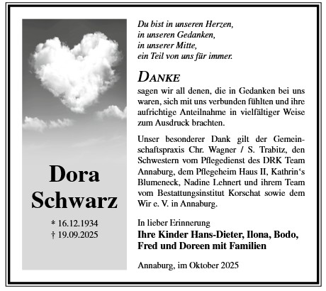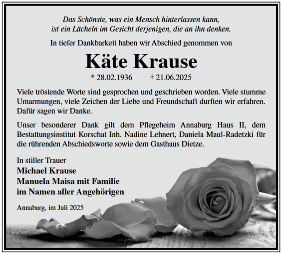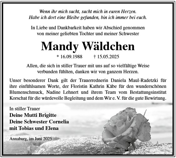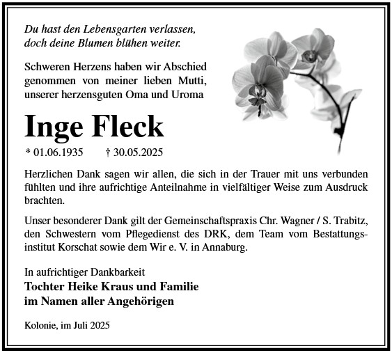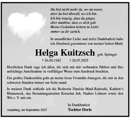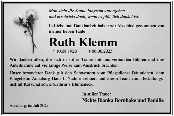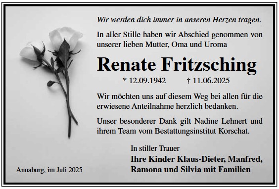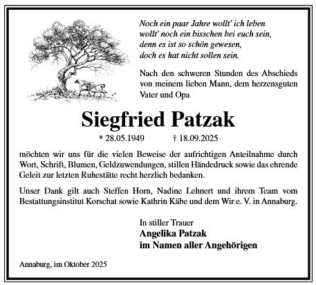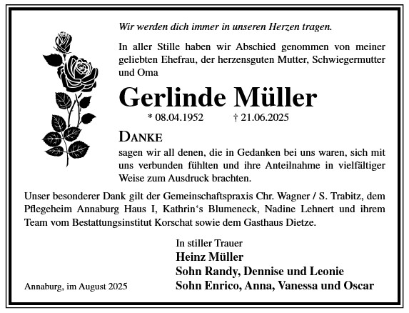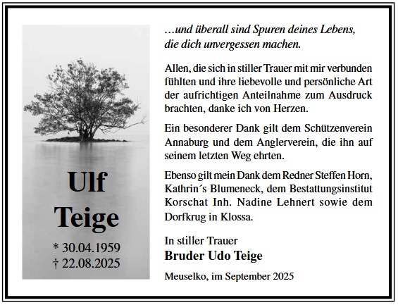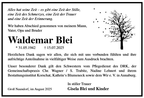 Die Trauerfeier mit anschließender Urnenbeisetzung findet am Sonnabend, d. 29.11.2025 um 11.00 Uhr auf dem Waldfriedhof in Annaburg statt.