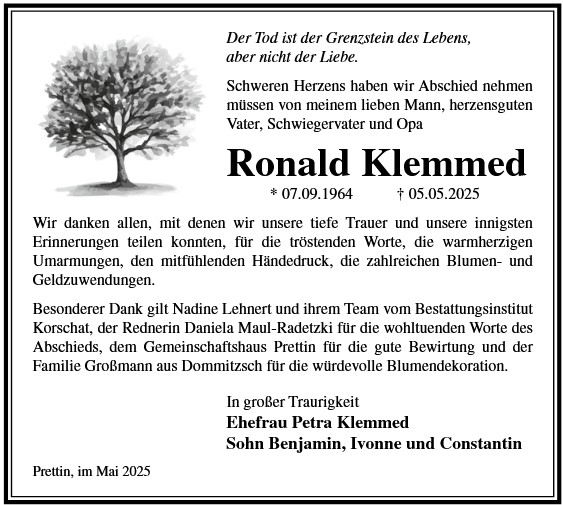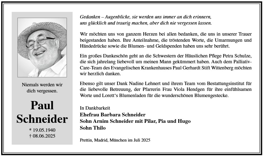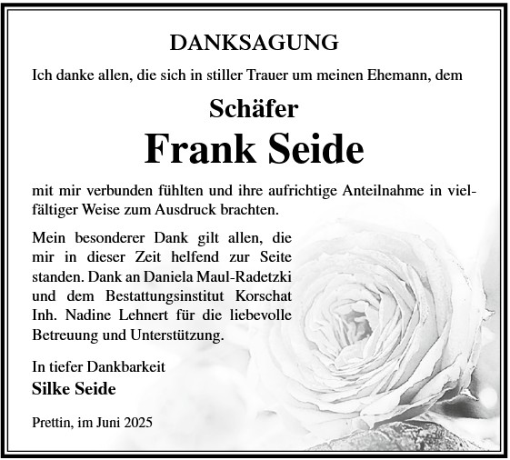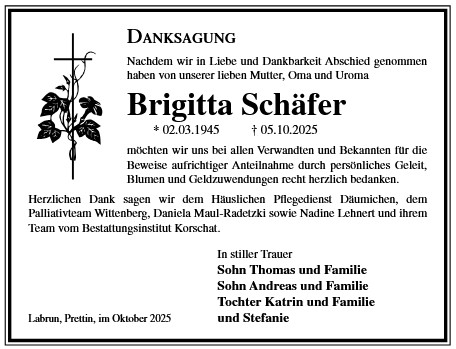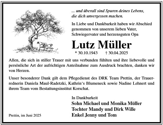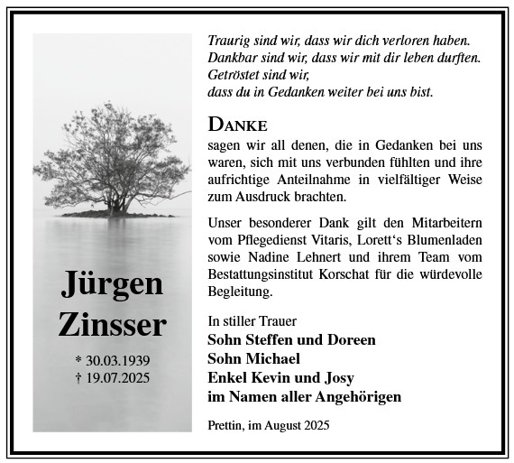 Die Trauerfeier mit anschließender Urnenbeisetzung findet am Freitag, d. 28.11.2025 um 11.00 Uhr auf dem Friedhof in Prettin statt.