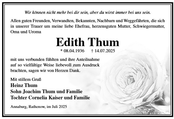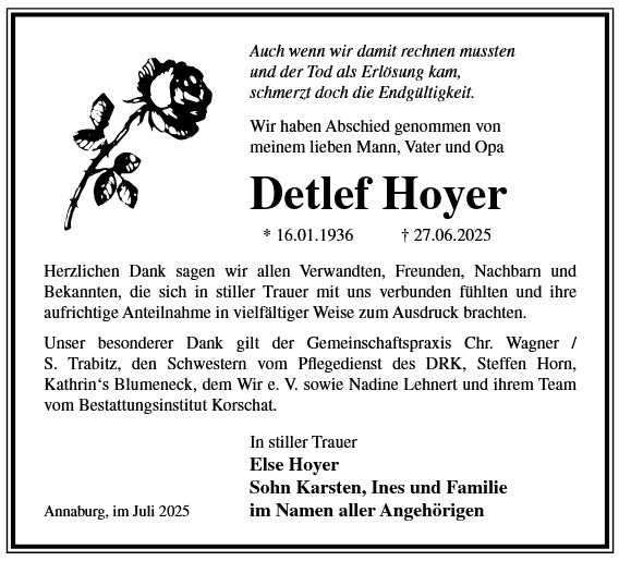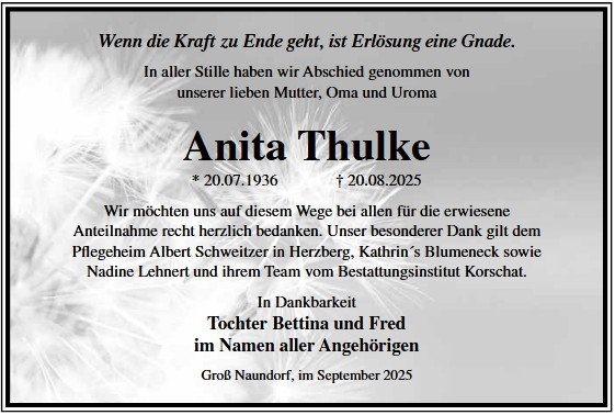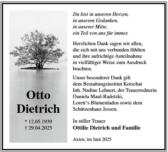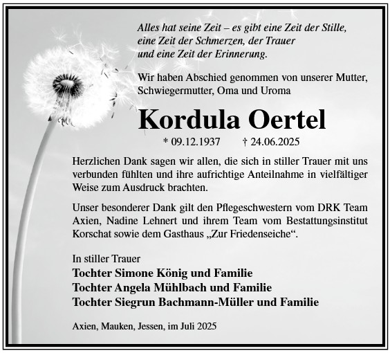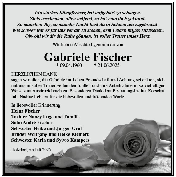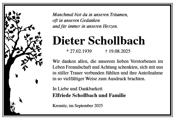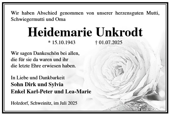 Die Trauerfeier findet am Sonnabend, d. 06.12.2025 um 11.00 Uhr auf dem Friedhof in Holzdorf statt. Von liebgedachten Blumenzuwendungen bitten wir Abstand zu nehmen, da die Beisetzung zu einem späteren Zeitpunkt erfolgt.