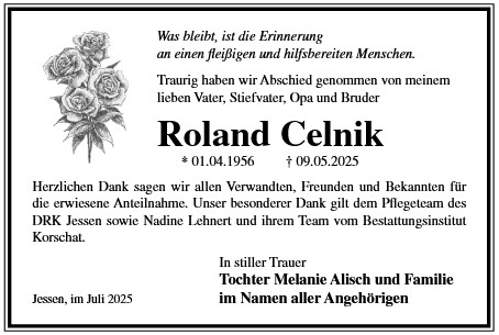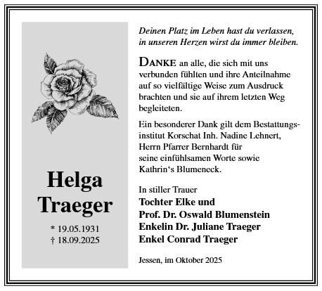 Die Trauerfeier mit anschließender Urnenbeisetzung findet am Freitag, d. 05.12.2025 um 14.00 Uhr auf dem Friedhof in Jessen statt.