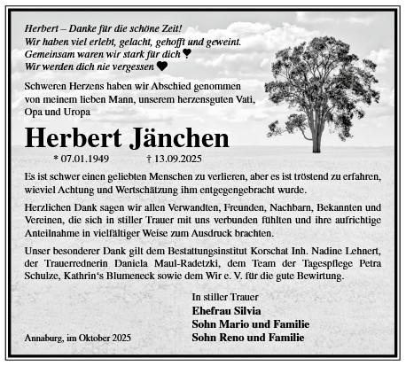 Die Trauerfeier mit anschließender Urnenbeisetzung findet am Sonnabend, d. 20.12.2025 um 11.00 Uhr auf dem Friedhof in Jessen statt.