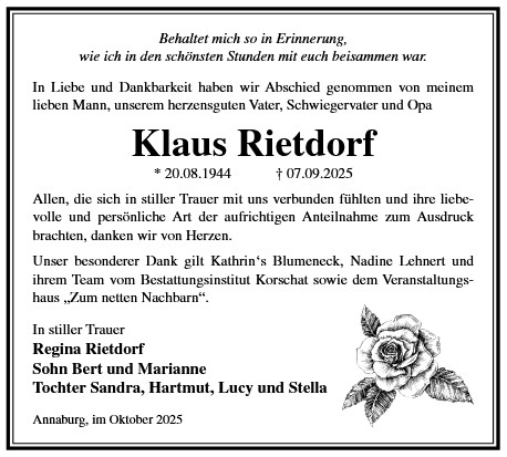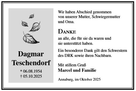 Die Trauerfeier mit anschließender Urnenbeisetzung findet am Sonnabend, d. 29.11.2025 um 11.00 Uhr auf dem Waldfriedhof in Annaburg statt.