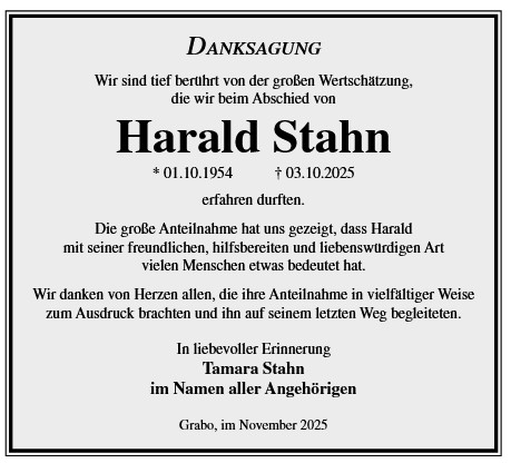 Die Trauerfeier mit anschließender Urnenbeisetzung findet am Sonnabend, d. 24.01.2026 um 14.30 Uhr auf dem Friedhof in Leetza statt.
