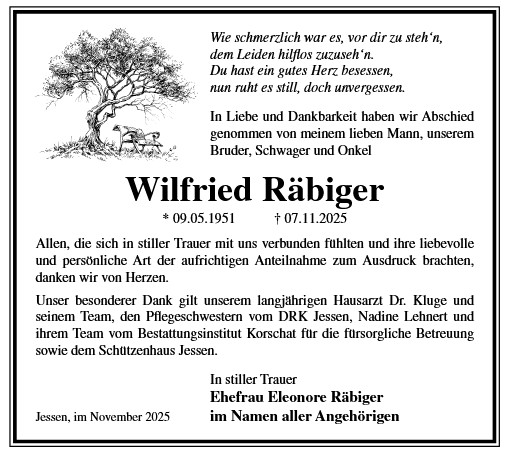 Die Trauerfeier mit anschließender Urnenbeisetzung findet am Sonnabend, d. 17.01.2026 um 11.00 Uhr auf dem Friedhof in Prettin statt.